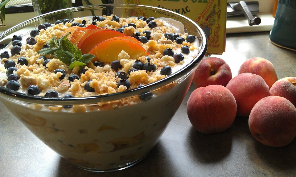 -Layer pound cake/Lady fingers on bottom of bowl-top with peaches and sprinkle blueberries sparingly-spread yogurt mixture and repeat layers ending with yogurt. Sprinkle slivered almonds, any remaining cake/fingers and blueberries add a sliced peach and sprig of mint-I used apple mint. Chill.