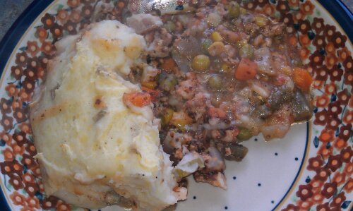 Transfer meat mixture into a casserole dish and top it with the mashed potatoes smoothing it to the edges.