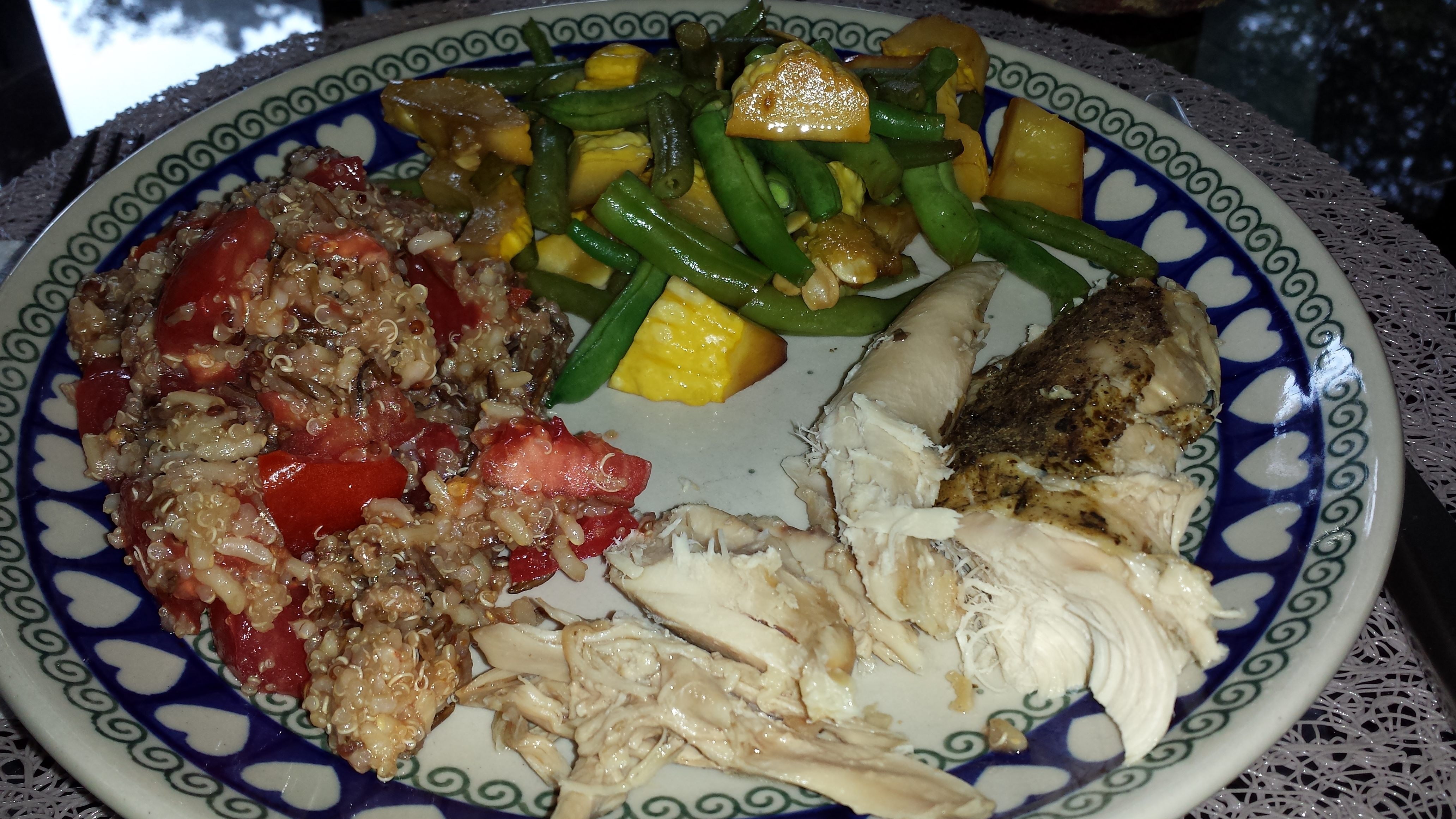 Sides: I used leftover quinoa-wild rice mixture from the night before, I didn’t heat it, I just added olive oil, a little salt & pepper and chopped tomatoes from my garden. I also sautéed yellow summer squash and cut up string beans from the garden. You can make a salad, simmer up some quinoa in just 15 minutes; while it’s cooking you can set the table or slow down, breathe deeply and slowly to unwind and de-stress a little bit after your busy day.