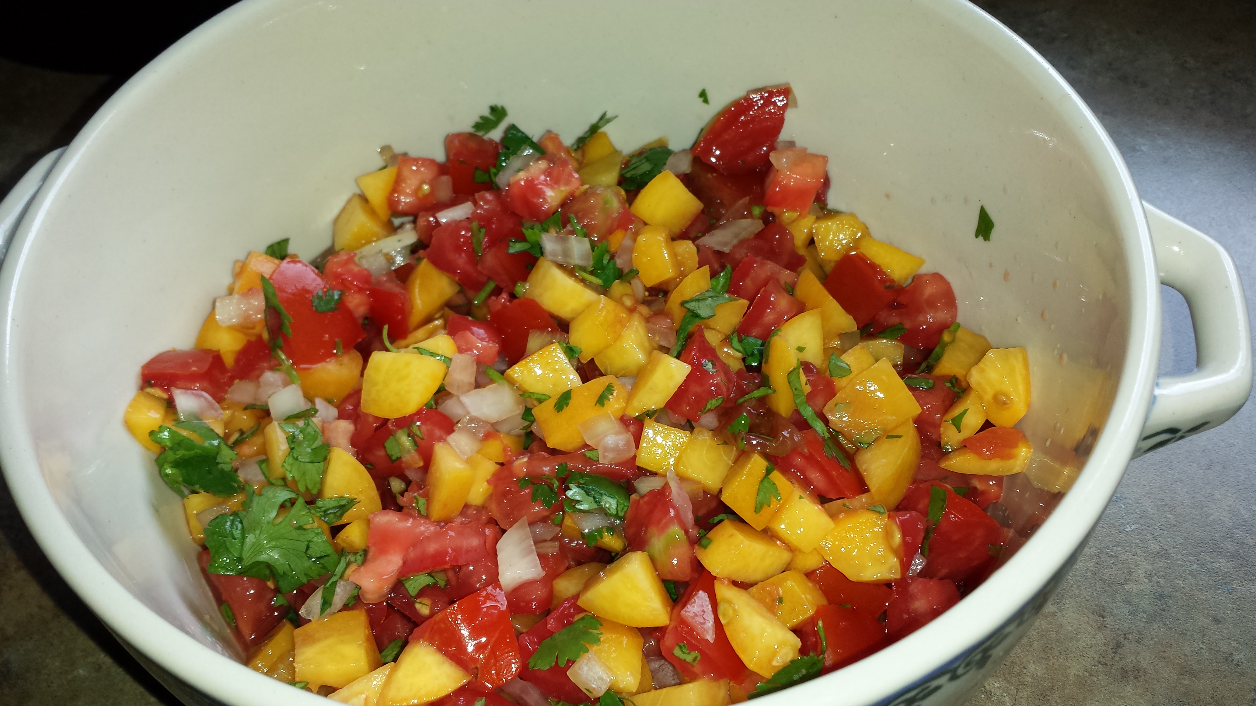 Dice tomatoes small, dice peaches small, toss all ingredients together, cover and refrigerate to let flavors blend.