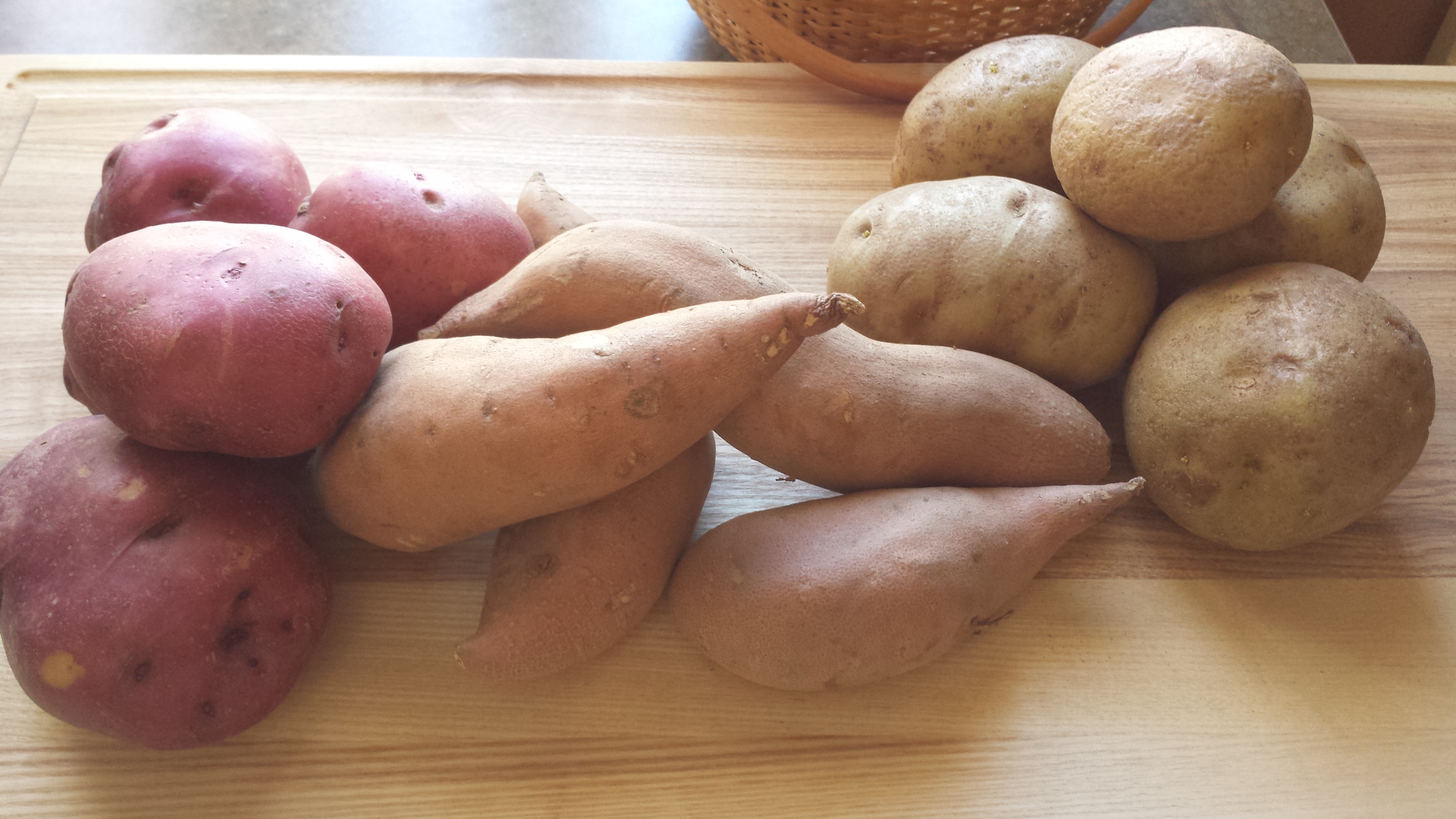 - Red/aka “new potatoes” – small-medium also – mashing, boiling, roasting, grilling, salad – medium sugar content = medium carbohydrate content