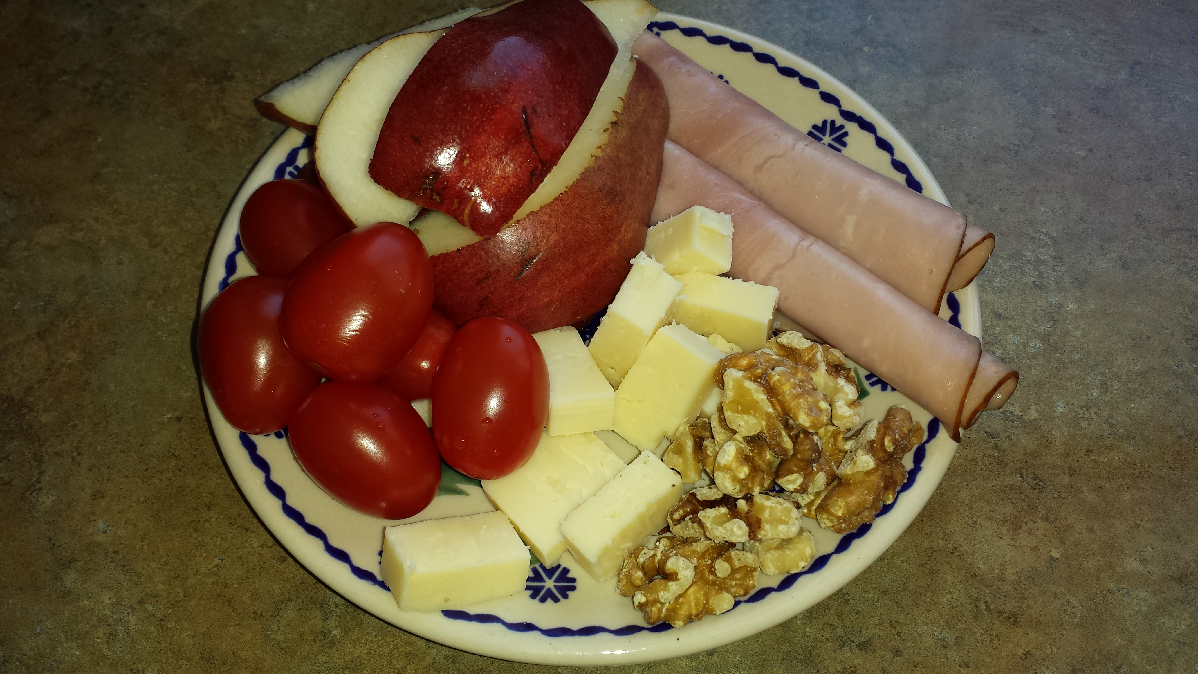 Lunch – 2 slices ham, 1 pear, 3 domino sized pieces of cheddar, cherry tomatoes and about 10 walnuts left me full until dinner time.