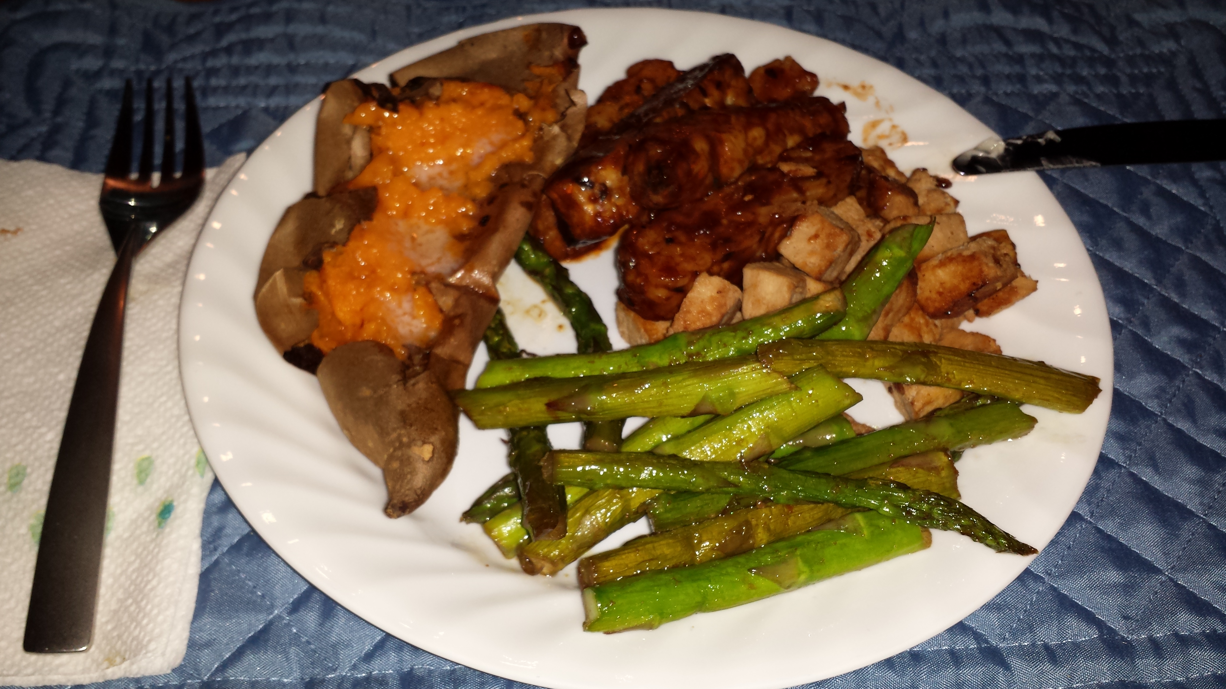 My meals today have been healthy, no bread and very little dairy, I had about 3 domino size pieces of sharp cheddar with lunch…I’ll post a photo, it was healthy and it was satisfying. Breakfast consisted of 2 eggs scrambled with some leftover cabbage and pea shoots and that held me until 1:30pm. For dinner I baked sweet potatoes and stir fried tofu, tempeh (fermented soybeans, healthier than tofu) with BBQ sauce and stir fried asparagus; again filling and satisfying and even the men in the house liked it, not minding that there was no meat. I had no snacks today as I wasn’t hungry. and as always, I’m drinking water.