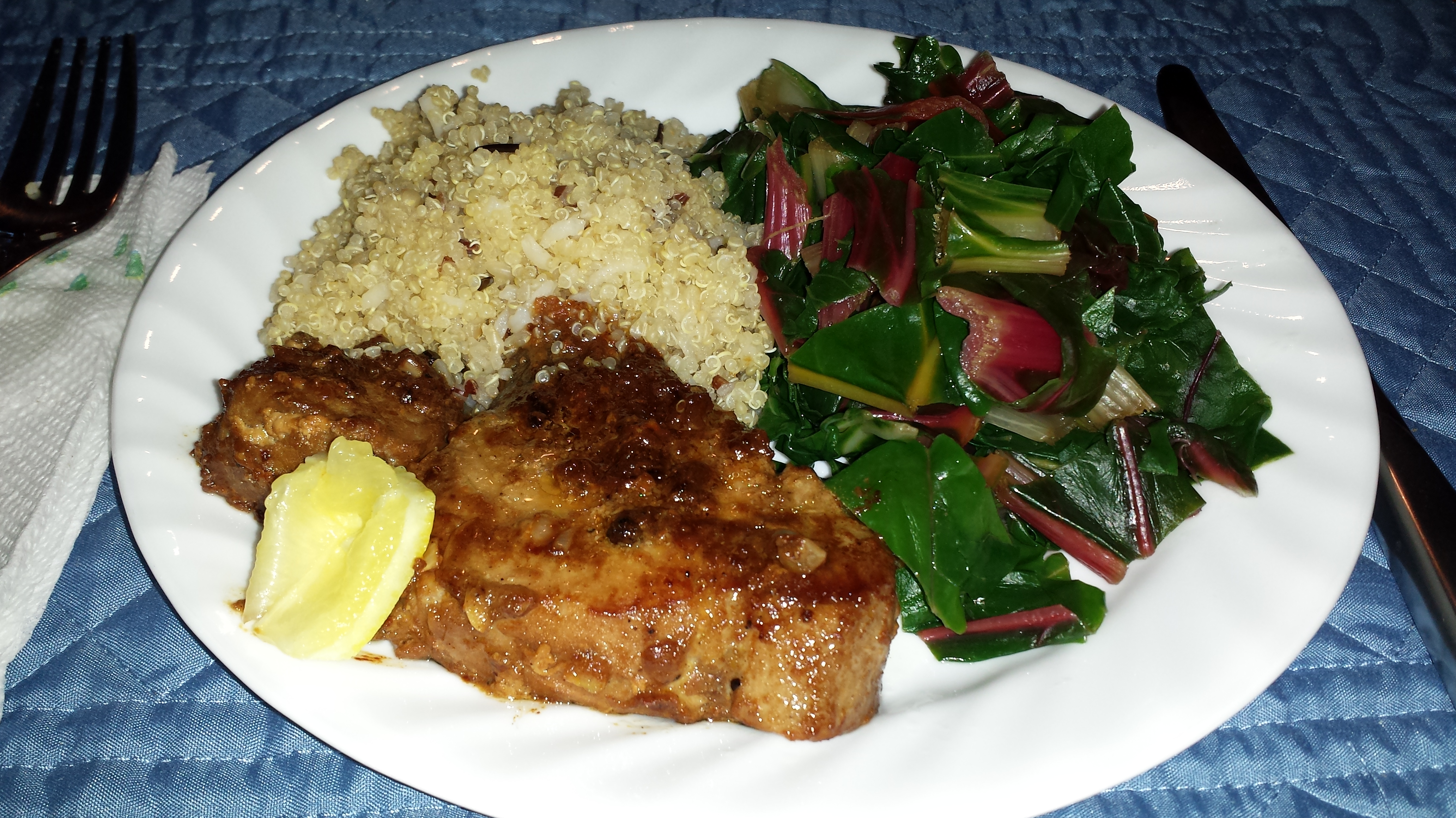 This recent meal included the yellowfin with the recipe from AllRecipes.com, a quinoa with some mild herbs and *steam-boiled rainbow chard – (* boiling and draining the water from chard helps get rid of some of the oxalates which can cause kidney stones) I sprinkled a little lemon juice on the Swiss chard and on the quinoa since the yellowfin marinade had plenty of salt in it. The tuna was clearly the star of the plate.
