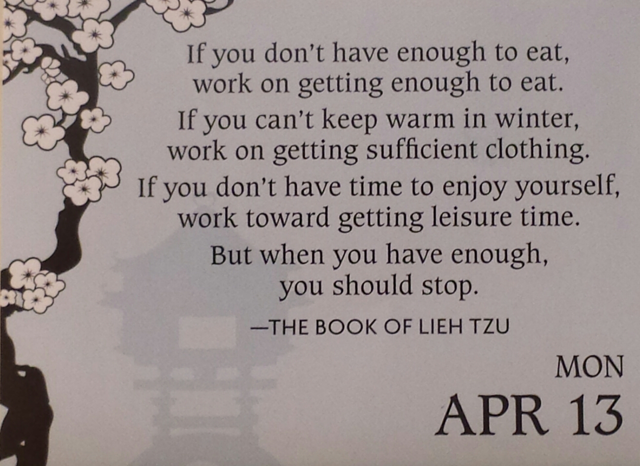 The calendar page quote for last Monday has been running through my mind all week. If you don’t have enough, work on getting enough, but when is enough plenty? Why do we most often want more?