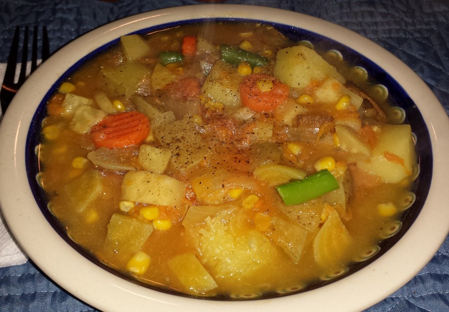 Cut all veggies into bite sized chunks, but not too small as they will cook down a bit. Add them all except the yams and beans, corn & peas to a large stockpot and simmer for about 40 minutes. Add the yams and rest of ingredients and simmer about 10 minutes more until yams are soft.
