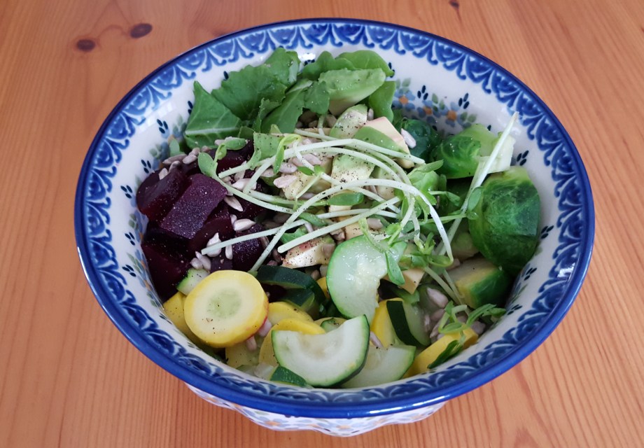 Steamed, sautéed or raw – sweet potato (baked), squash, kale, spinach, pea sprouts, beets, carrots, celery, asparagus, broccoli, cauliflower, peas, bean sprouts, other sprouts, any greens you enjoy… Fruit choices, sliced or chopped apple, pear, pineapple, mango, kiwi, orange/Clementine