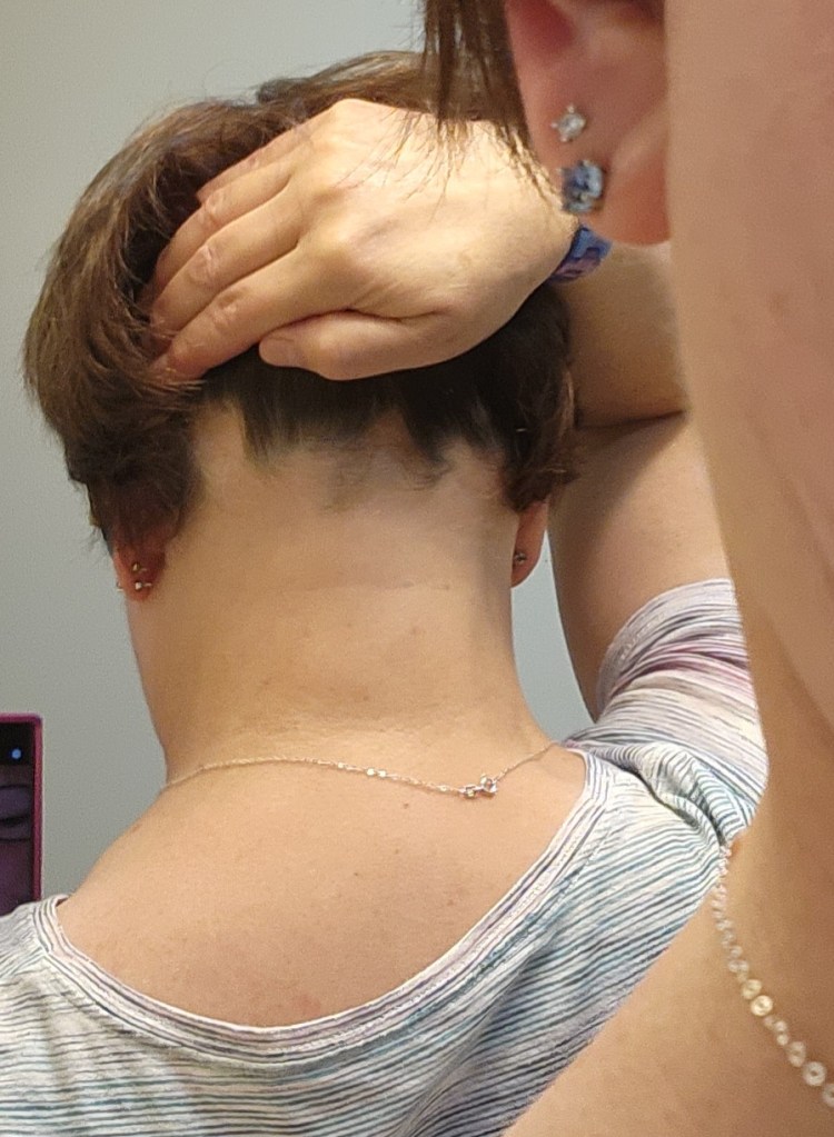 All inside bald patches are growing in and about 2-3″ long. Nape area is showing new growth.