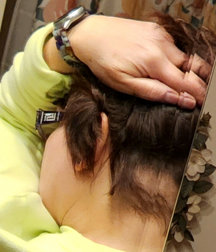 All inside bald patches are growing in and about 2-3″ long. Nape area is showing new growth.